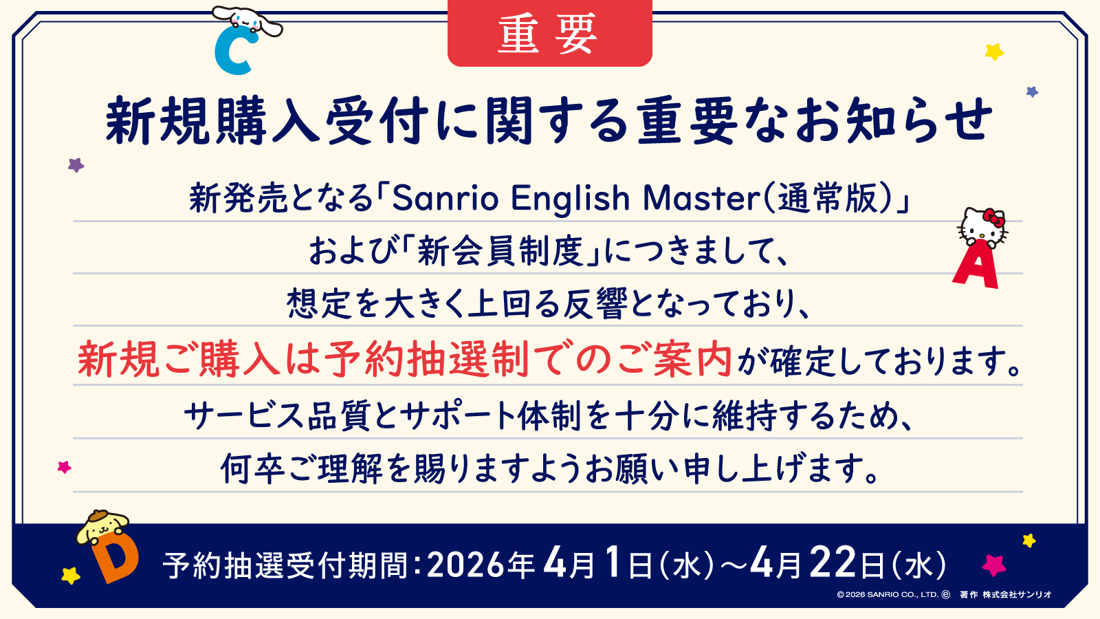 Sanrio English Masterのご予約ですが、先行予約初日から想定を上回る多くのお申込みをいただいており、抽選制となることが既に確定となっております。
